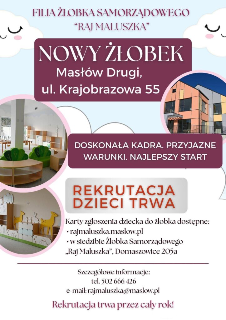 Zapraszamy do zapisów do nowo otwartej filii Żłobka Samorządowego „Raj Maluszka” w Masłowie Drugim przy ul. Krajobrazowej 55. Żłobek to doskonała kadra, przyjazne warunki – najlepszy start!
